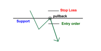 此时,价格逐步回升到被突破的支撑水平位置。如果在被突破的支撑水平位置,买方力量够大且足够的亏损多头头寸被平仓的话,价格将出现反转开始再次下降。这一现象很好的解释了为什么支撑位被突破后会变成阻力位。可能大家也猜到了,要想充分利用这一现象我们需要的就是耐心,跟支撑位被突破后马上进行交易的积极式交易法不同,保守式交易法等待价格在被突破的支撑位出现“回调”后才入场。直观效果见下图: