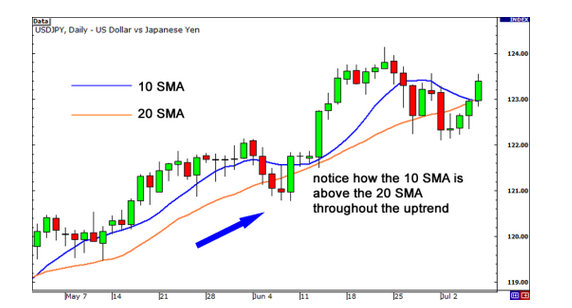 以上是一个USD/JPY的日图。我们在上面的图中可以看到价格一直处于上升趋势中,并且在整个上升趋势中,10期的移动平均线一直处于20期移动平均线上方。把移动平均线的知识与之前学过的趋势线知识综合起来,这样我们可以对市场价格走势做出更加可靠的判断,也能更好的知道我们此时应该买入还是卖出。