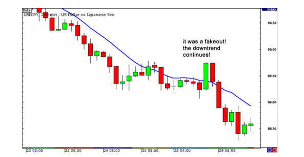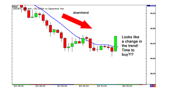 这时你可能会想:“ 嗯,价格趋势可能会改变方向(出现反弹),应该买入了。” 然后你重仓买入USD/JPY,因为你坚信价格将会上涨。但事实证明,交易者们只是对这一新闻事件作出了暂时性反应而已,价格的总体趋势并没有发生改变,仍然继续下跌!请看下图:
