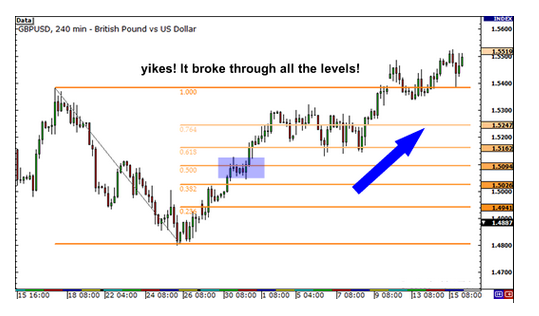 前面我们曾讲过,所有的支撑位与阻力位都是暂时性的,最终都会被突破。斐波那契回调位也有失灵的时候,它并不是万无一失的。我们通过一个具体例子来看看斐波那契回调失灵的时候回发生什么样的事情。下面是一个GBP/USD四小时图: