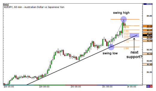 上图中,我们通过震荡低点82.61和震荡高点 83.84绘制出斐波那契回调位。我们可以看到,该上升趋势线分别与0.500回调位以及0.618回调位相交。那么这些位置可否看作潜在的支撑水平呢? 只有一种方法可以找出答案,请看下图: