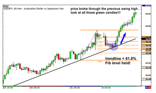 你猜怎么着?如上图所示。0.618斐波那契回调位形成了很好的支撑位,价格在该支撑位反弹之后重回上升趋势。很显然,如果我们在此位置建立多头头寸的话,那确实是非常完美的进场位置。价格触及趋势线之后的几个小时内,价格一路攀升最终突破该波段的震荡高点,走出一波漂亮的升势!