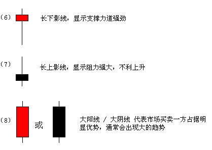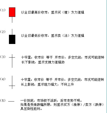 K线又叫阴阳烛,发源于日本米市场买卖记录。每一个K线均记录着四项资料—开盘价、最高价、最低价及收盘价,以开盘价及收盘价作成长方图形,并以红色表示开盘价低于收盘价的状况,称为收红,则显示买方的推升力道较强。以黑色长方图形表示开盘价高于收盘价的状况,称为收黑,表示卖方力道较强,将价格向下拉。红色或黑色的部分称为身体。在实体下方的线是由开/收盘价向下延伸至最低价,显示盘中的最低价位,称为下影线。因为下影线是买方将价格由低处向上推升的痕迹(价格没有收在最低,意味在该处买方势力强于卖方),因此下影线具有买方力道的意味。同理,在实体上方的线显示盘中的最高价位,称为上影线,具有卖方力道的意味存在。此处所用的开盘、最高、最低、收盘价位,并不限于日价格,时间大小可以任意选择,最高/低价指该期间内所发生的最高/低价位,而开盘价是指该期间首日的开盘价,收盘价则为该期间最后一日的收盘价位。