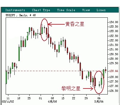 黎明之星与黄昏之星形态上刚好相反,同样以三个单位组成:第一单位,市场走势持续下跌中,出现一根身体较长的大阴烛。第二单位,波动幅度缩小,构成星的部分,第三单位,出现大阳烛,而且升上或者超过第一根蜡烛的区域。