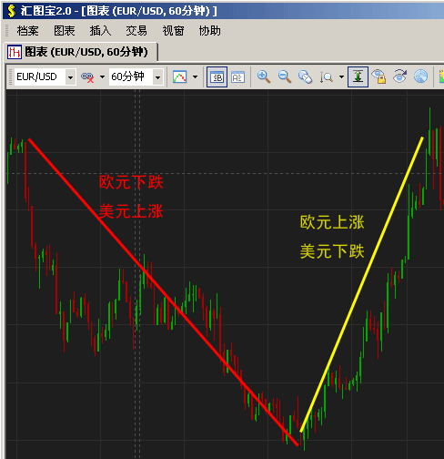 这是一张 EUR/USD 的60分钟图 ,货币对的 欧元写在前面,美元写在后面,就是说图表是以欧元为基准的,如果美元对欧元升值,那么就是欧元对美元贬值,图表就是下跌的,反过来如果欧元对美元升值,图表就是上涨的,所以如果您看涨美元,看跌欧元,您需要做空 EUR/USD 货币对,而不是做多此货币对,这是交易时需要注意的方向问题。