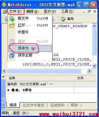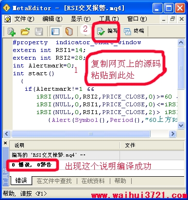 试着点一下“编写”,如果左下角出现“0错误,0警告”,那说明源码没问题,编译通过了,成功生成了ex4可执行文件