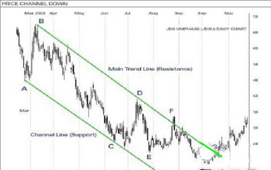 外汇价格通道(Price Channels)是延续图形,它的斜度倾向上或向下,视乎它的价格成交集中于上趋势线或下趋势线之内。上趋势线是一条阻力线,而下趋势线则是一条支持线。当价格通道有向下趋势倾斜时便视为跌市,而价格通道向上倾斜时,则视为升市。