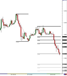 下面是一个欧元兑美元的小时图,我们选中波段高点,即05年7月15日的1.2137,然后选中05年7月18日的低点1.2021,然后再去斐波纳契最高的回调位1.2085,然后画出了斐波纳契扩展位。它们是1.2041(0.382),1.2027(0.500),1.2013(0.618),1.1969(1.000),1.1925(1.382),1.1911(1.500)和1.1897(1.618)。