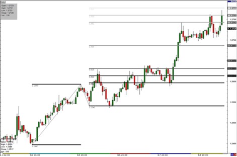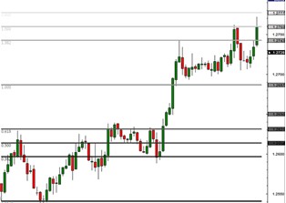 交易软件立即自动地绘出斐波纳契扩展位:1.2597(0.382)、1.2631(0.618)、1.2687(1.000)、1.2743(1.382)、1.2760(1.500)和1.2777(1.618)。