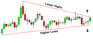 在上图中我们可以看到最高价在不断的下跌,从而形成了上趋势线。下趋势线则形成一条支撑线,在这里价格行动几乎没怎么变动。