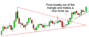 交易者通常用对称三角形来寻找突破:也就是说这种形态到一定的时候,价格会果断的朝某一个方向运动。与我们在“布林挤压”中解释的那样,在整理后的突破看起来就像下面这样: