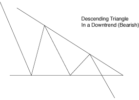 在上升三角形里交易者会等待向上突破,下降三角形则有所差别,在这里交易者将面临熊市来临,最终将会坐等价格向下突破下支撑线。