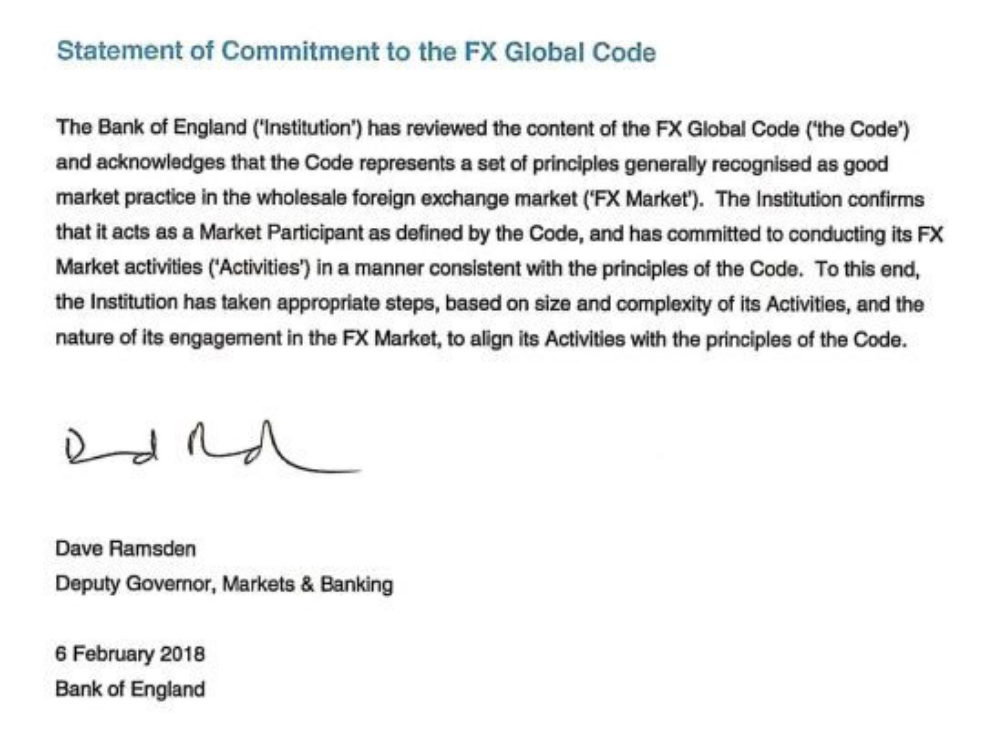承诺声明:即遵守《全球外汇市场准则》的“承诺声明”(Statement of Commitment)。“承诺声明”有一个标准化的格式,市场参与者签署了“承诺声明”后,表示该市场参与者自愿遵守这一准则。