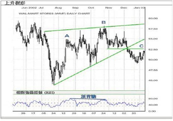 上图是一个上升楔形的例子,价格于七月中由一个跌市开始慢慢下跌,在A点和B点相符的新低,分别形成新高。但相对强弱指数(RSI)显示,由A点至B点间的升幅却出现了顶背驰。当下斜线与价格相遇,上涨趋势没有足够的动力使价格推上,价格随即跌穿支持线C点,下跌趋势因此而持续。
