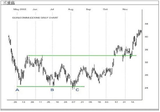 三重底(Triple Bottom)是三重顶形态的倒影,在跌市中以三点相约之低点而形成。在价格向上摆动时,发出重大转向讯号。与三重顶相比,三重底图形通常拖延数月时间及穿破阻力线才被确认为三重底图形。另一种确认三重底讯号,可从成交量中找到。当图形过程中,成交量会减少,直至价格再次上升到第三个低位时,成交量便开始增加,形成一个确认三重底讯号。