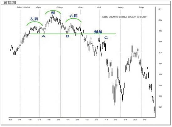 头肩顶(Head & Shoulders Top)是最为常见的倒转形态图表之一。头肩顶跟随上升市势而行,并发出市况逆转的讯号。顾名思义,图形以左肩、头、右肩及颈线组成。当三个连续的价格形成左肩时,其成交量必需最大,而头部次之,至于右肩应较细。