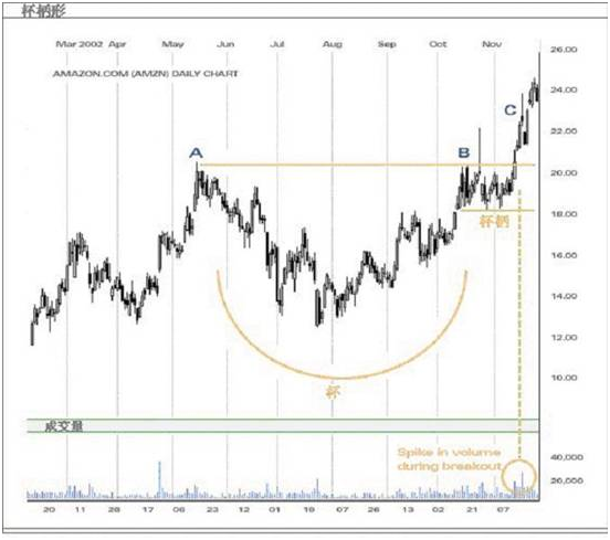 以上为例,在遇到A点的阻力位前,价格正在上升。不到六个月,杯的形态已形成,而且相遇阻力位B点。价格随后徘徊在同一个交易价格约一个月,然后穿破阻力位,确认了杯柄形。成交量也提供了一个委明确的指标,确认这图形的准确性。因成交量在破位前后增加,代表出现大量买家。