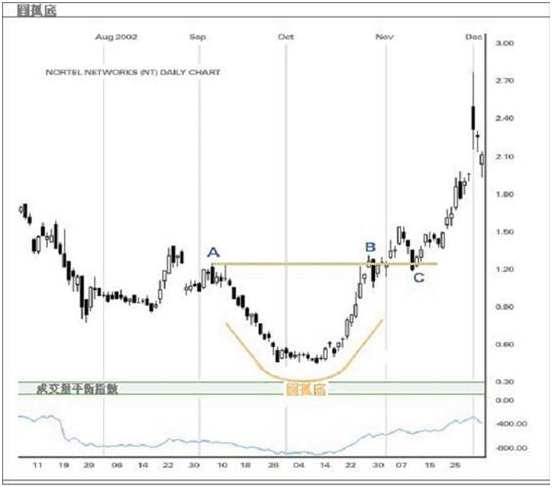 圆底常常在一个长期跌市后出现,低位通常记录新低及回跌。圆底形态可分为三部份:下降、最低及上升。