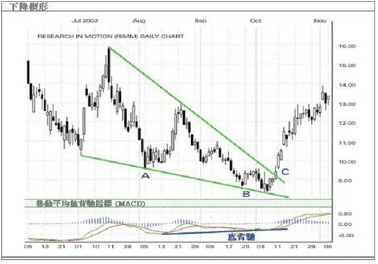 上图是一个下降楔形例子,价格一直向下滑,以A点和B点相符的新高,分别形成两个新低。但移动平均背驰指标(MACD)显示,在A点至B点间的跌幅却出现了底背驰。当下斜线与价格相遇,下涨趋势没有足够的动力把价格推低,价格随即升破C点的阻力位。上升趋势因此而持续。