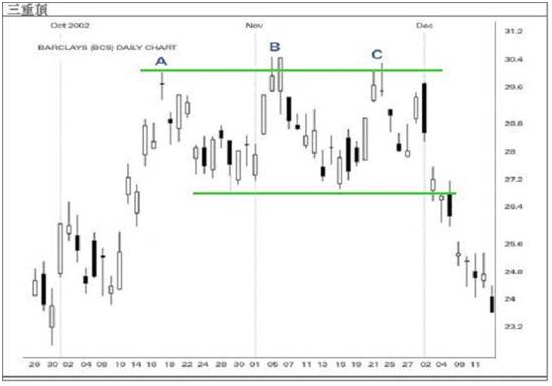 上述例子显示,当价格上升到A点,交易徘徊在这区域约一个多月后,仍未成功穿破B点与C点之阻力位。因没有需要之情况下,价格开始回落,而且跌破三重顶图形的支持位,确认了向淡趋势图形。随后再升回此价位,尝试穿破这图形形成的阻力位(前市的支持位)。