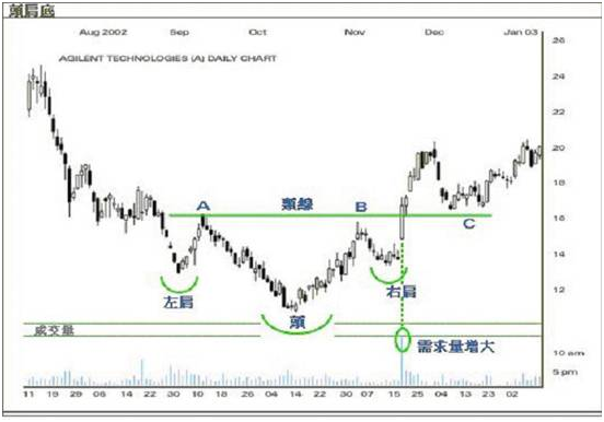 上述图例,左肩A点形成在一个正下跌及整固的市况。颈线从A点开始形成后,再次回落约一个月,形成头部。随后价格开始反弹,到B点再度回落,形成右肩。直到颈线的第二点出现,成为阻力线(即B点)。价格随后因有大量成交而上升穿破阻力位(颈线),头肩底图形从而确认。升破颈线后,可能有抽后情况发生,如不跌穿颈线,市势将向着目标幅度而上升。