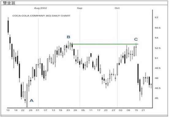 根据以上图例,由A点到B点是一个上升趋势。当遇到阻力位时,市况随即回落。在低位停留3个多月后,市况再次上升到另一个高位C点。但后市迅速下滑而形成双顶图形。由此可见,趋势确实已经逆转,如果价格跌破A点价位则发出一个穿破支持位的讯号。