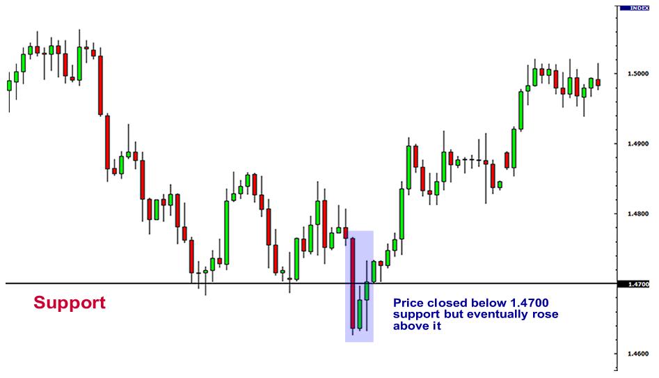 在这一情况下,汇价收盘已经跌破1.4700支撑位,但是随后却再次上涨至该线上方。