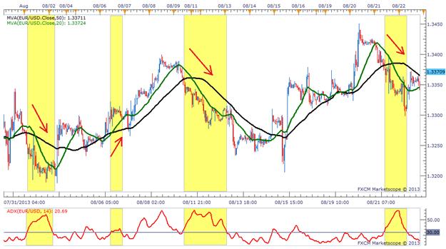 当ADX大於30时,交易信号更可信。排除了欧元/美元对区间震荡的时期,仅在长期趋势有效时入场交易。或许有些盈利交易也被ADX滤去,不过可以接受。总体来说,ADX为您排除了更多的损失交易,因此对於此类区间交易,它是一个总体优秀的指标。