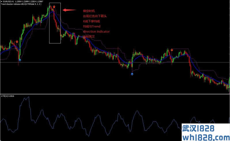 2. 做空时机:红色向下箭头;K线下穿均线;均线与Trend direction indicator指标死叉。
