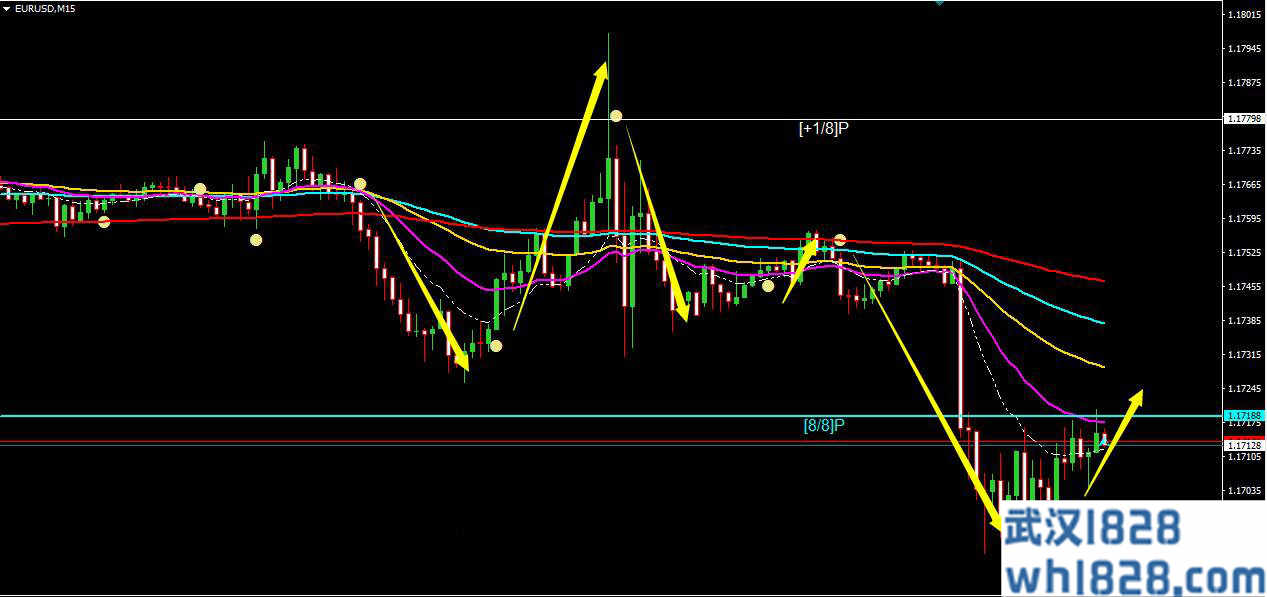 第一境界交易系统MT4经典指标模板主要由主图窗口和两个指标窗口构建而成,主图主要由多周期均线和自动压力支撑以及多空提示圆点组合而成,简