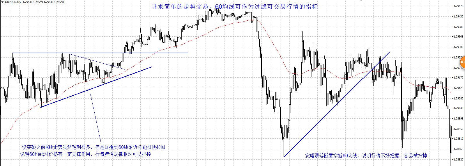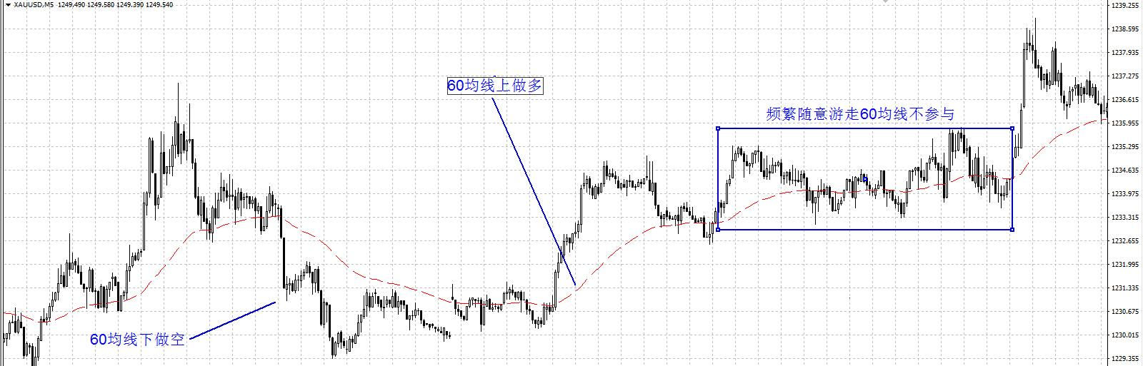 2.60均线上做多不做空,60均线下做空不做多,作为多空交易方向的分水线,价格频繁上穿下串60均线的判定为震荡行情,不参与。