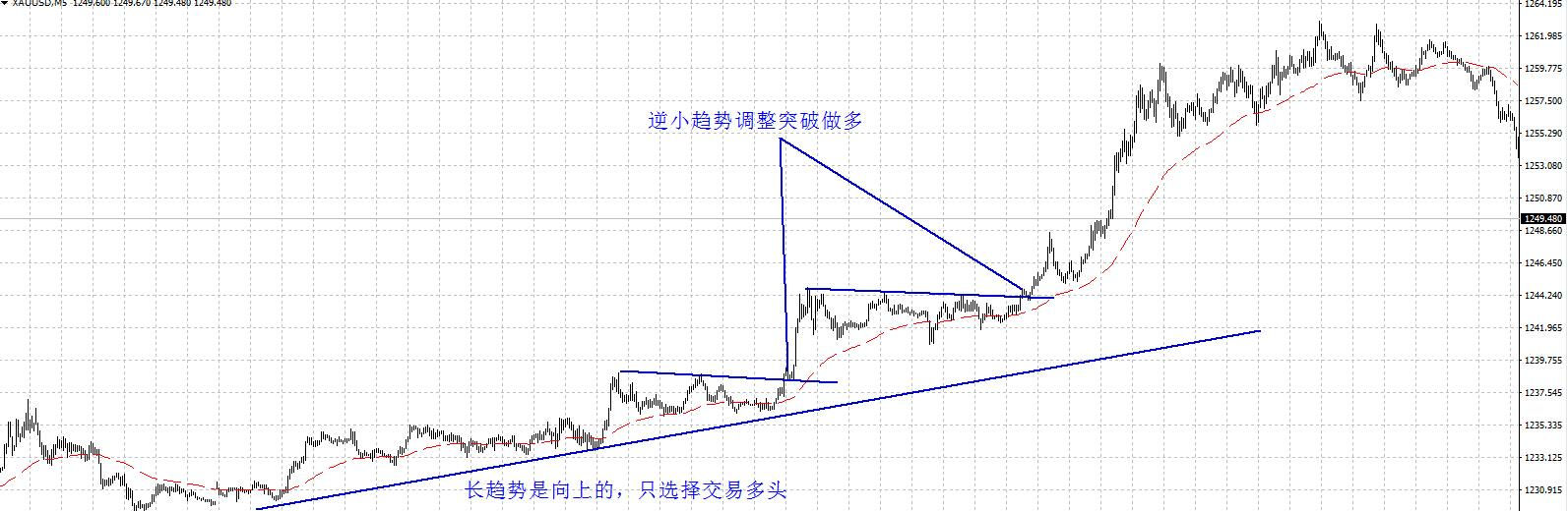 3.顺长趋势的选择交易方向,逆长趋势的小趋势调整结束后出现有效的突破选择入场。