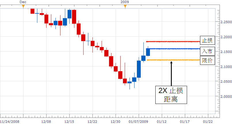 在设置止损与限价时, 我们建议:限价距离至少应是止损距离的 2 倍。 也就是使用 1:2 或者以上的风险回报率。