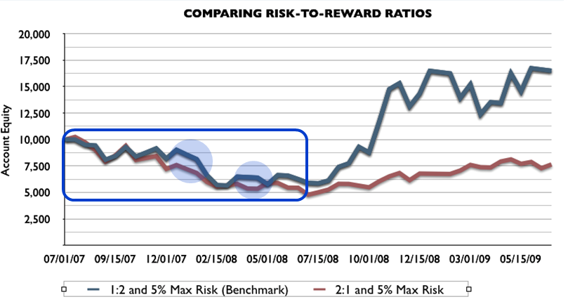 在比较两种测试表现时,有两件事情马上引起了我的注意。第一,从2007年7月至2008年7月,标准资金管理方法的表现几乎与第一种次佳方法的表现一致,大多时候只稍好一点点。这是因为虽然两种方法都使用了100点的止损,但标准方法使用了200点的限价而次佳方法只有50点的限价,所以标准方法更容易挽回亏损,因此在第一年中,其表现略好于次佳方法。