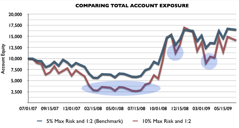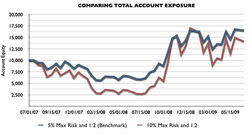 大部份人可能都愿意在任何一个时间让更多账户净值承受风险, 因为他们希望和预期自己能获得更多的盈利。但是这些图表再次展现了稳健资金管理的长处。请看两种方法在 两年中和第二年结束时的账户净值,风险较大的方法的测试很少能胜过风险较小的标准资金管理方法的测试。但这个特殊的结论并不适用于任何市况及交易实例。单看第一年从2008年7月至2009年7月的交易,似乎次佳方法比标准方法表现还要好,但这是因为当时市况下不适合使用MACD交易策略。我们都知道未来存在不明朗因素,无法知晓市况是否利好。但我们可通过限定暴露在外的风险,以维持更多的账户净值并更长久的留在市场中。