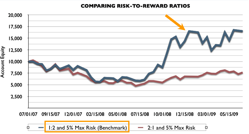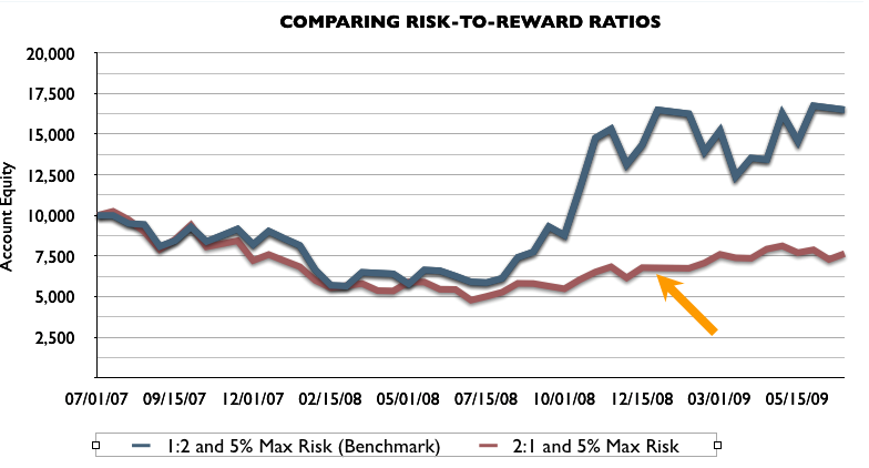 首先来看第一张图表, 在此我们展现的是标准资金管理方法的测试结果,使用1 : 2的风险回报比例,且每笔交易仅有5%的账户净值来承受风险。具体说来,也就是每笔交易设置了100点的止损和200点的限价。