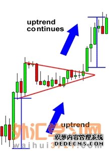 无论经过涨势还是跌势,买方或卖方通常在赶上参加同一方向之前停顿一下,喘一口气。 正因为如此,价格通常会形成一个微小的对称三角形,这是所谓的旗型。