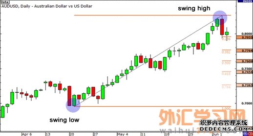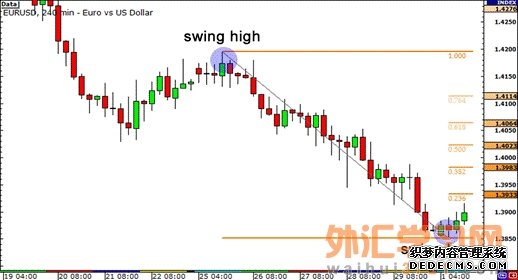 为了找到这些回撤水平,你必须找到最近的秋千摆动的高点和低点。然后,对于下跌趋势,点击秋千上的高点并拖动光标到最近的摆动低点。