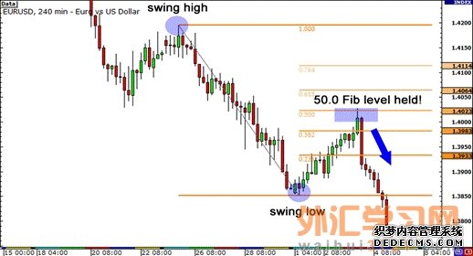在这两个例子中,我们看到,价格在斐波纳契回撤水平发现了临时支撑或阻力位。因为使用了斐波纳契工具,这些水平就成为了自我实现的支撑和阻力水平。