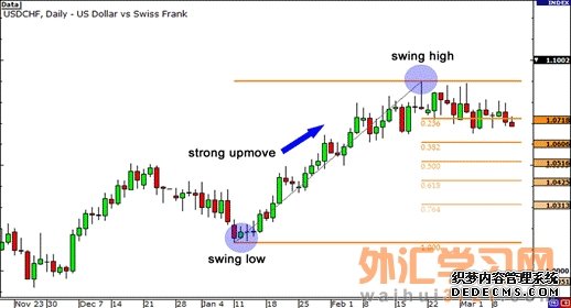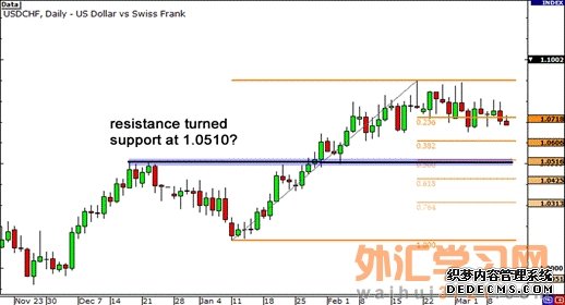 让我们看一个怎样你才可以将支撑和阻力水平与斐波那契水平相结合的例子。以下是美元/瑞郎日线图。