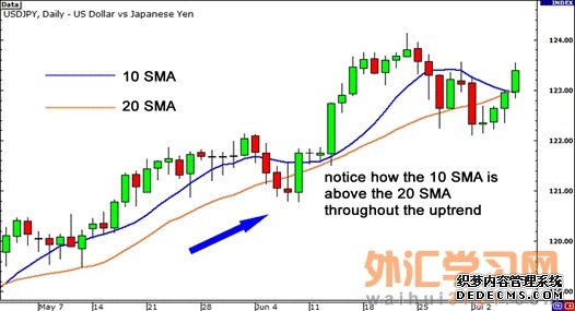 处于上升趋势中,较快的移动平均线应高于较慢的移动平均线,反之亦然。 例如,假设我们有两个均线:10SMA和20SMA。 在您的图表中,它看起来像这样: