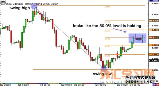 在这里,您会看到在下滑趋势的一对数据,然后你决定拿出你的斐波纳契工具来帮助你发现一个很好的切入点。你使用的是摆动高点1.5383和摆动低点1.4799。