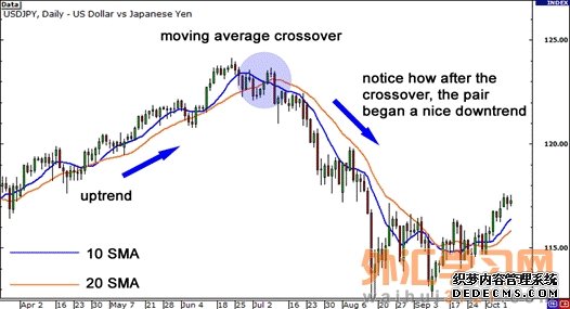 让我们再一次看看美元/日元的平均线图,它有助于解释移动平均线交叉交易。
