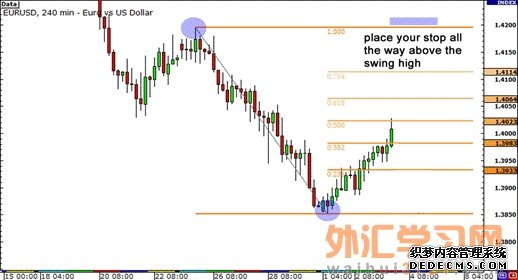 假设你对在哪里得到支持和阻力相当的有自信,那就可以在斐波那契回撤水平下设置止损。而且,正如我们前面指出的,使用绘图工具不是一门精确的科学。市场可能会迅速攀升,到达你的止损,并最终往你的方向走。通常当我们到一个角落,就开始将我们的脑袋往墙上撞。