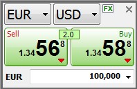 如果你想卖欧元,你点击“卖出”,您将出售1.34568欧元。如果您想购买欧元,你点击“购买”,您将购买1.34588欧元。