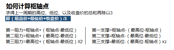 枢轴点的算法其实很简单:交易者只需算出上一周期的高位、低位、以及收盘价的总和再除以3。通过该枢轴点,交易者可以寻找出3个潜在的支撑位以及阻力位,如下图所示: