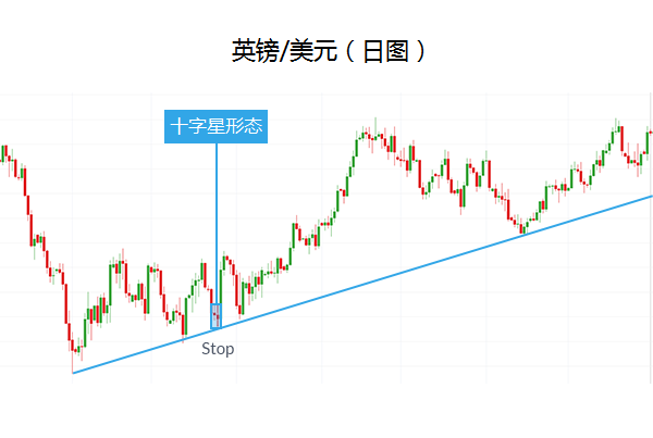 一旦您懂得识别并运用十字星,您就可以将其利用到各种各样的交易策略里。因为十字星本身不会提供有关市场动向的任何信息,所以十字星可以配合使用其他支撑、阻力趋势线以达到更好的效果。上图就是一个很好的例子:十字星位于支撑线的正上方,且当时汇价正在下行,所以将其作为反转信号,预期英镑/美元有望重返上升趋势,进而做多英镑/美元将会是不错的选择。
