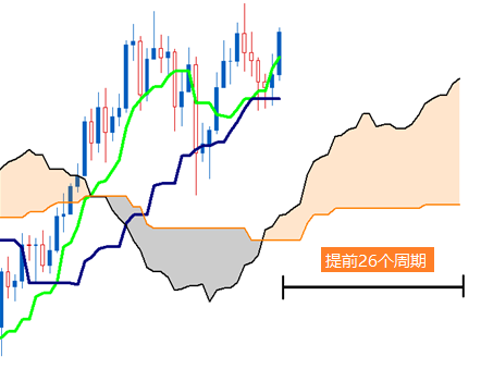 云带的另一个特征就是它会较价格提前26周期。所以当您打开一张新的图表时,您会看到云带已经达到了当前价格之后的26个周期之多。但交易者们需要注意的是,这一特征并没有任何预测价值。