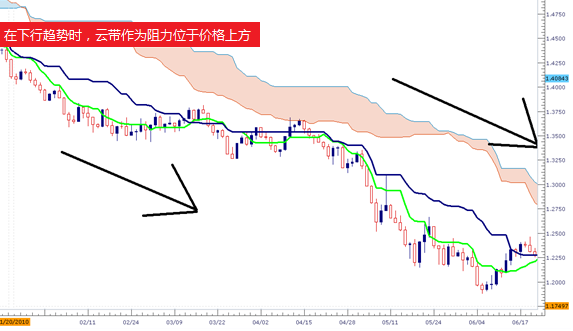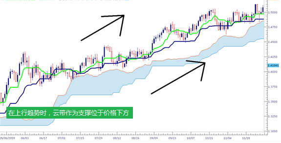 说是云带,其实就是先行带A与先行带B之间的区域。根据系统默认设置,该区域在上行趋势里会呈现蓝色,并在下行趋势里呈现红色。同样的,在上行趋势里,云带被交易者们广泛作为支撑使用;而在下行趋势里则被作为阻力使用。这使得云带成为了交易者们利用基准线和转换线交叉进入交易后寻找止损点的极佳指标。