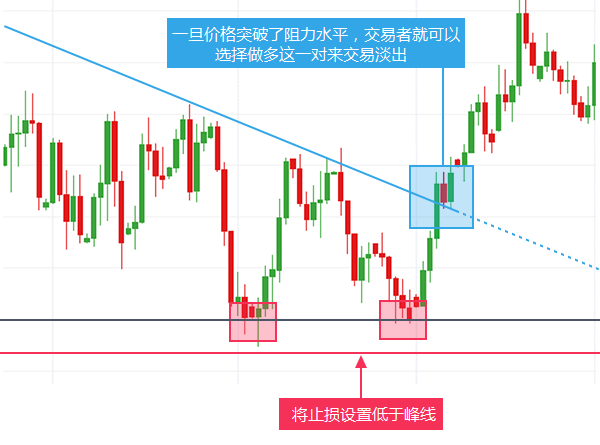 一旦价格突破了阻力线,交易者们就可以考虑入场了。在这个例子里,我们是期望当前的下行趋势淡出的,所以我们会寻找买入信号的确认,即为突破阻力水平。如果相反的,我们是在交易双重顶淡出的话,我们就会寻找卖出信号的确认。